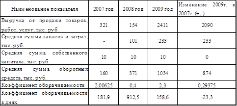 В 2009г. по сравнению с 2007г. деловая активность предприятия повысилась на 0,29375 . Собственный капитал в 2009г. по сравнению с 2007г. не изменился и составил 10 тыс. руб. Средняя сумма запасов и затрат в 2009 году по сравнению с 2007 годом изменилась на 233 тыс. руб. Так же изменения произошли в количестве выручки от продажи товаров изменения составили 2090 тыс. руб. Коэффициент оборачиваемости выраженный в днях в 2009 году уменьшился по сравнению с 2007 годом на 23,3.