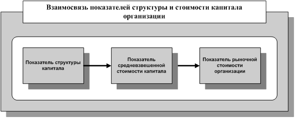 Структура капитала оказывает непосредственное влияние на формирование рыночной стоимости организации. Эта связь характеризуется показателем средневзвешенной стоимости. Поэтому концепция структуры капитала исследуется в комплексе с концепцией стоимости капитала и концепцией рыночной стоимости организации.