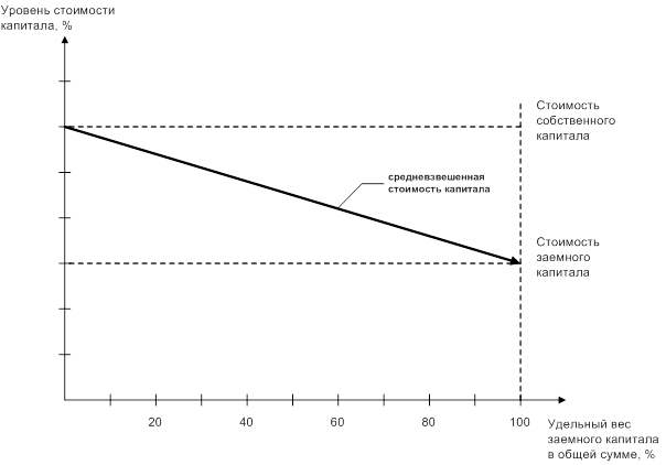 Исходя из этого при любом сочетании собственного и заемного капитала, содержание традиционалистской концепции механизма оптимизации структуры капитала организации сводится к следующему: рост удельного веса использования заемного капитала во всех случаях приводит, к снижению показателя средневзвешенной стоимости капитала, а соответственно и к росту рыночной стоимости организации.