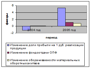 Мы видим, что увеличение фондоотдачи основных производственных фондов, ускорение оборачиваемости материальных оборотных фондов, увеличение прибыли на 1 руб. реализации продукции к 2005 году положительно повлияли на изменение чистой прибыли предприятия, хоть и малозначительно.