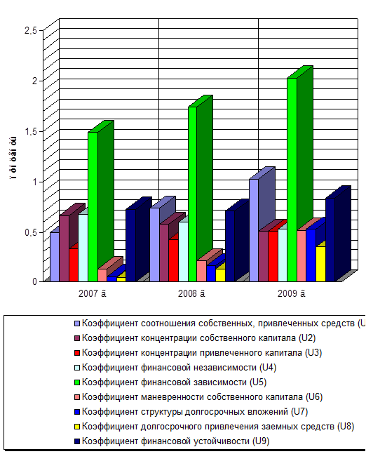 На рисунке 6 мы видим, что показатель соотношения собственных и привлеченных средств в 2007 г. на каждый рубль собственных средств, вложенных в активы предприятия приходится 49 коп. заемных средств, в 2008 г. приходится 74 коп., а в 2009 г. соответственно - 1,03 руб., что превышает нормативный уровень на 0,3 коп. Такой рост показателя (на 105,81 %) свидетельствует об усилении зависимости предприятия от кредиторов и внешних инвесторов. Но, как было сказано выше, это связано с незавершенным строительством, т. е. нельзя конкретно утверждать о снижении финансовой устойчивости предприятия. Подтверждением данной ситуации является значение показателя концентрации собственного капитала, его значение уменьшилось за три года на 23,74 % - это показывает усиление зависимости предприятия от внешних кредиторов, причем значение показателя в 2007-2009 гг. меньше нормы. Логично, что значение показателя концентрации привлеченного капитала увеличилось на 54,55 %, так как сумма двух последних показателей должна быть равна 1.