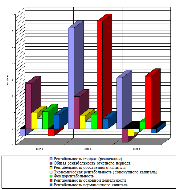 Общая рентабельность в 2007 г. составил 2,77 %, в 2008 г. 1,97%, в 2009 г. –0,82 %. Видим, что предприятие в 2009 г. не получило прибыли.