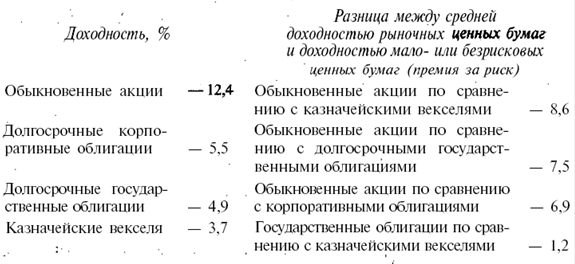 1. Модель оценки доходности финансовых активов (САРМ). При принятии решения о реинвестировании прибыли менеджеры фирмы пользовались информацией о доходности рыночных ценных бумаг известных аналитических и консалтинговых фирм страны. По данным этих фирм средняя доходность основных типов ценных бумаг и разница между средней доходностью рыночных ценных бумаг и доходностью мало- или безрисковых ценных бумаг составила за ряд лет следующую величину.