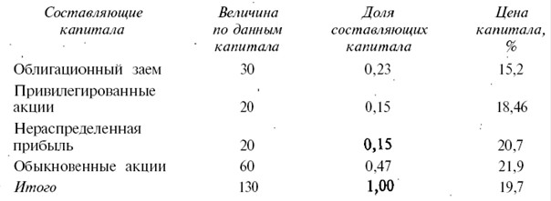 Цена капитала фирмы = 0,23 • 15,2% + 0,15 • 18,46% + 0,15 • 20,7% + 0,47 • 21,9% = 19,7%.