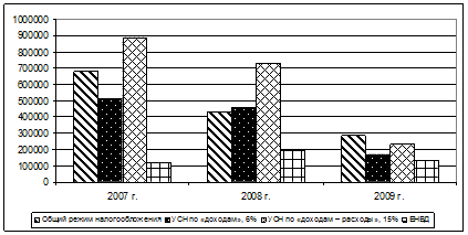 На первый взгляд, в 2007-2009 гг. – наиболее приемлемым для ООО «ТК «Бытошь-Стекло» был ЕНВД, но в дальнейшем, когда доходы предприятия резко сократились, сумма налога осталась прежней и даже возросла в абсолютном выражении (в отличие от других режимов), из-за изменения корректирующих коэффициентов. То есть данный режим налогообложения не учитывает возможные изменения финансового положения предприятия, динамику его доходов, экономическую ситуацию в целом и этот режим налогообложения следует рекомендовать предприятию только до определенного момента времени.