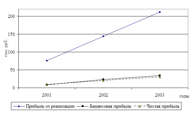 Вместе с тем происходит увеличение затрат на производство продукции, что связано в первую очередь с увеличением цен на сырье и материалы, а также тарифов на перевозки и электроэнергию. Это сказалось на изменении объема прибыли от реализации, которая с каждым годом растет и составляет в 2003 году 279% по сравнению с базисным периодом 2001 года.