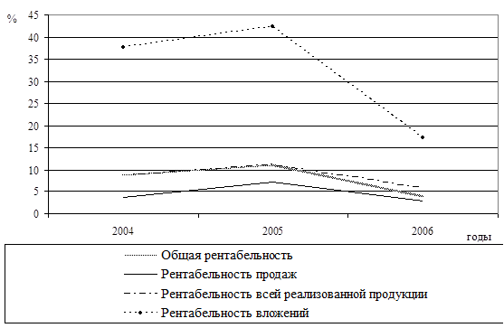 Данные таблицы показывают, что значения показателей рентабельности сравнительно неплохие, но тревогу вызывает снижение всех показателей в 2006 г. (рис. 8).