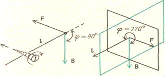 быть перпендикулярна как напряженности магнитного поля В, так и проводу I. Направление силы может быть найдено или с помощью правила правого винта для векторного произведения, или обращением к модели линий магнитного поля. Модуль силы равен F=ILBsinj где j — угол между линиями поля и проводом. Когда угол j = 90°, сила максимальна и имеет направление, которое считается положительным в соответствии с правилом правой руки. Когда j=0, действующая на провод сила равна нулю. Когда j =270°, ток в проводе имеет противоположное по сравнению с первым случаем направление; сила максимальна, но теперь имеет направление, принимаемое за отрицательное.