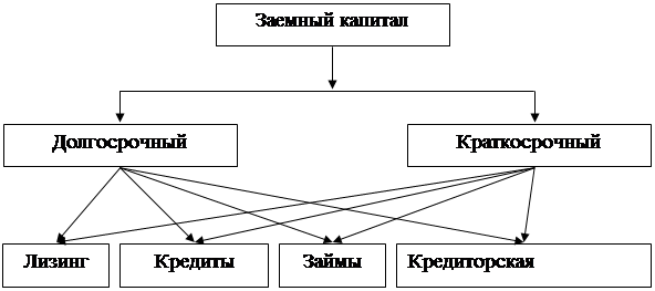 Заемный капитал (рис 3) – это кредиты банков и финансовых компаний, займы, кредиторская задолженность, лизинг, коммерческие бумаги и др. Он подразделяется на долгосрочный (более года) и краткосрочный (до года).