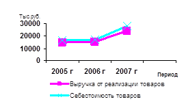На рисунке 6 представлена динамика изменения результатов реализации услуг, где наглядно представлены изменения показателей выручки и себестоимости в период 2005-2007 гг. Очевидно, что убыток от реализации услуг связан с превосходящей суммой себестоимости над суммой полученной выручки.
