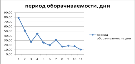 По Графику 2.2 видно, что оборачиваемость в 2008 году снижалась и достигла 10 дней в ноябре. Это говорит об эффективном управлении дебиторской задолженностью. С января период оборачиваемости сократился почти в 8 раз. Хотя средний период за 11 месяцев 2008 года составил 31 день. В связи с переходом в 2009 году на новые договорные условия (увеличение отсрочки по основным дебиторам) период оборачиваемости дебиторской задолженности в первом квартале 2008 составил 52 дня. Однако с апреля по ноябрь 2008 года (т.е. с начала использования факторинга) средний период гашения составил 23 дня. Таким образом, сравнивая средние значения за январь-март и за апрель-ноябрь (именно средние значения обеспечивают сопоставимость данных), можно сделать следующие выводы: