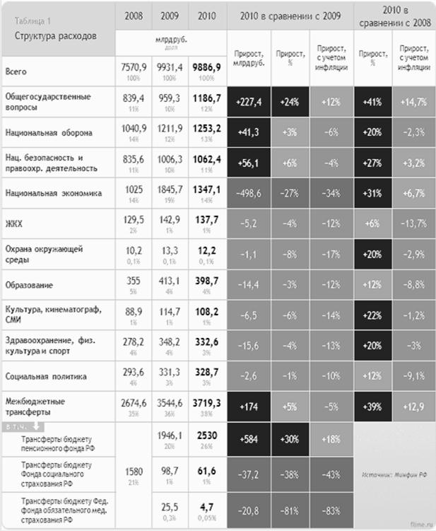 Общая картина ясна: расходы бюджета-2010 незначительно отличаются от расходов-2009. При этом в структуре бюджета-2010 значительно выросли показатели общегосударственных расходов и межбюджетных трансфертов (за счет увеличения трансфертов пенсионному фонду), а также умеренно выросли расходы на нац. оборону и нац. безопасность (+3,4% и +5,6%). При практически неизменном общем объеме расходов бюджета-2010 в сравнении с бюджетом-2009 для финансирования вышеприведенных увеличившихся расходов были значительно сокращены расходы на национальную экономику (-500 млрд, или -27%), трансферты другим бюджетам (кроме трансфертов пенсионному фонду РФ), а также умеренно (в пределах 4—9%) были сокращены другие статьи расходов: на ЖКХ, образование, здравоохранение, культуру и т. д.
