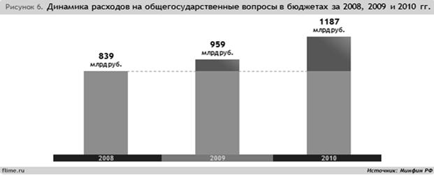 Статья "Общегосударственные вопросы" увеличивается на протяжении всех 3 лет. Рост планируемых в 2010 году расходов на 227,4 млрд. рублей обусловлен, в основном, ростом расходов на международные отношения и международное сотрудничество (+34,5 млрд.), на обслуживание государственного и муниципального долга (+101 млрд.), а также ростом расходов на "другие общегосударственные вопросы" (+113 млрд.).