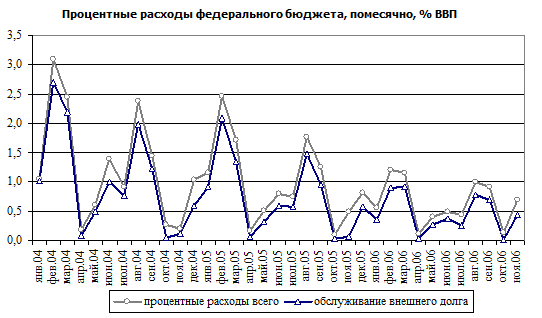 Процентные расходы федерального бюджета по итогам одиннадцати месяцев были ниже прошлогодних, что вызвано погашением в 2005 и 2006 году значительной части внешнего долга без его рефинансирования. По этой же причине график обслуживания заимствований в текущем году является более равномерным по месяцам.