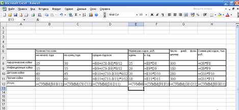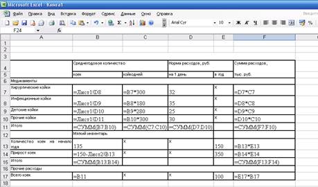 Рис 2. Формулы расчетов расходов на медикаменты, мягкий инвентарь и прочие расходы.