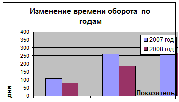 Из данных таблицы видно, что произошло увеличение оборачиваемости всех приведённых показателей. Оборачиваемость дебиторской задолженности увеличилась по сравнению с 2007 годом с 1,39 оборотов в год до 1,94 оборотов, то есть по сравнению с предыдущим годом погашение дебиторской задолженности происходило более быстрыми темпами, хотя эти показатели очень малы. Время оборота дебиторской задолженности составляет 259 дней в 2007 и 186 дней в 2008 году. Это говорит о том, что дебиторская задолженность погашается медленно. Изменение времени оборота по годам представлено на рисунке 2.