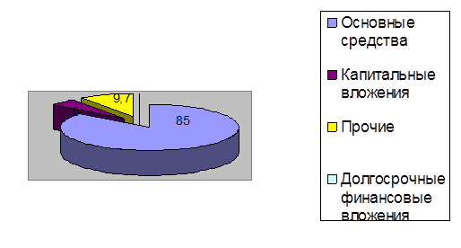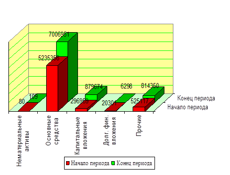 В составе внеоборотных активов имело место увеличение стоимости всех видов имущества, кроме долгосрочных финансовых вложений. В отчетном году стоимость основных средств возросла на 33,84 %, а выручка от реализации продукции на 30,6 %. Это свидетельствует о нерациональном увеличении активов. Несмотря на абсолютный прирост стоимости основных средств, их удельный вес в валюте баланса снизился с 67,45 до 63,15 %.