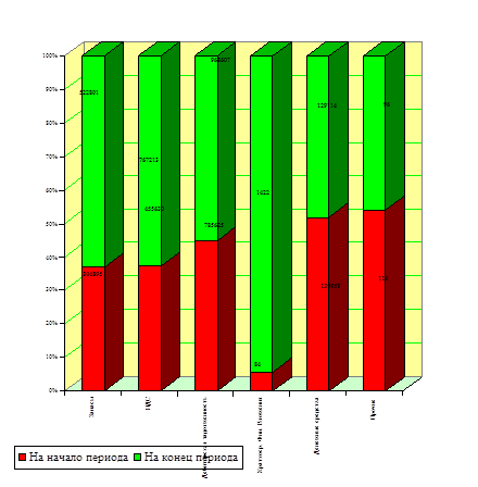 На начало отчетного периода стоимость мобильного имущества составила 1666306 руб. За отчетный период она возросла на 722947 руб., или на 43,3 %. Удельный вес оборотных средств в стоимости активов предприятия повысился незначительно и составил на конец года 21,5 %.