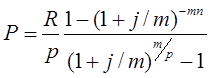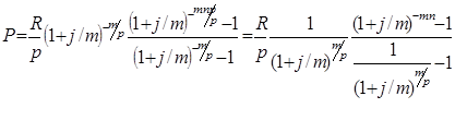 Приведя последнее выражение к общему знаменателю, и упростив его, получим формулу для расчета современной ценности р-срочной финансовой ренты с начислением процентов m раз в год: