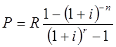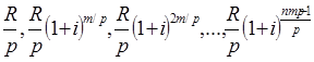 Данный ряд представляет собой геометрическую прогрессию со знаменателем (1+i)m/p, первым членом прогрессии R/p и числом членов прогрессии nmp.