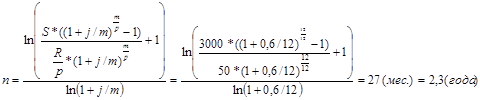 Ответ: n = 2,3 года, или необходимую сумму в 3 000 д.ед. можно накопить в течение 2 лет 3 месяцев, если ежемесячно вносить в банк 50 д.ед. под 60 % годовых.