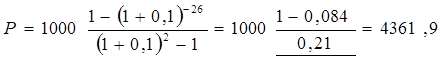 Какую сумму надо положить в банк, чтобы в течение следующих 26 лет иметь возможность снимать со счёта каждые два года по 1000 д.ед., исчерпав весь счёт к концу этого срока, если банк начисляет на деньги, находящиеся на счёте, 10 % годовых?