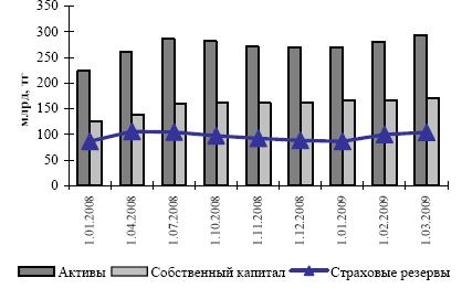 За два месяца 2009 года совокупные активы страховых организаций увеличились на 9,3%, составив на 1 марта 2009 года 293,91 млрд. тенге. Совокупный собственный капитал увеличился на 2,6% и составил 170,2 млрд. тенге. Сумма резервов оставила 103,9 млрд. тенге.