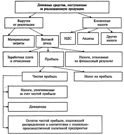 Если поступление выручки на денежные счета предприятия — завершение кругооборота средств, то ее использование представляет собой как начало нового кругооборота, так и стадию распределительных процессов, при которой формируется доходная база бюджетов разных уровней и обеспечиваются тем самым общегосударственные интересы, а также образуются собственные финансовые ресурсы предприятия.