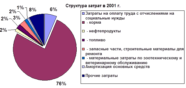 Диаграмма 2 построена по данным таблицы 4 и наглядно представляет структуру затрат птицефабрики "Махачкалинская в 2001 году. Как видно из диаграммы 2, наибольшую часть в структуре затрат составляют корма – 76 %. Затем идут прочие затраты – 8 % и затраты на оплату труда – 6 %. Эти три статьи составляют в сумме 90 % затрат на производство. Остальные статьи составляют оставшиеся 10 %. (Приложение 1)