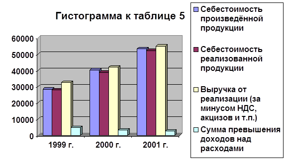Данные таблицы 5 и гистограммы к ней свидетельствуют о росте себестоимости произведённой продукции и, соответственно, росте себестоимости реализованной продукции и выручки от реализации. Однако сумма превышения доходов над расходами снижается из года в год. Это говорит о том, что предприятие неэффективно увеличивает объёмы производства. Соответственно, снижается и степень покрытия затрат со 116 % до 105 %. Если производство будет продолжаться такими темпами, то вскоре предприятие просто перестанет получать прибыль, несмотря на увеличивающиеся объёмы выпуска продукции.