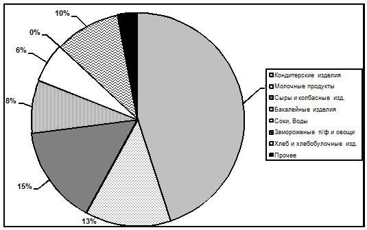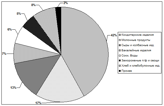 Структура товара оборота представляет собой – соотношение отдельных товарных групп в общем объеме товарооборота магазина, выраженное в процентах. Отметим, что ООО «магазин» Мария Ра относится к предприятиям розничной торговли продовольственными товарами – являясь с 1965 г. булочной-кондитерской. Как видно из рисунка 4.1. и 4.2. основную долю в товарообороте ООО магазин «Мария Ра», как в 2006, так и в 2007 г. занимают кондитерские изделия, их доля составляет 45% и 42% соответственно по годам.