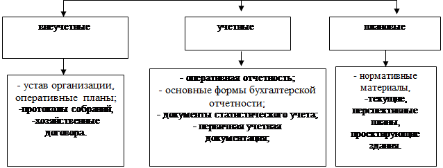 К плановым источникам относятся все виды планов, которые выполняются в организации (текущие, перспективные, оперативные), а также нормативные материалы, проектные задания, сметы, ценники, и др.