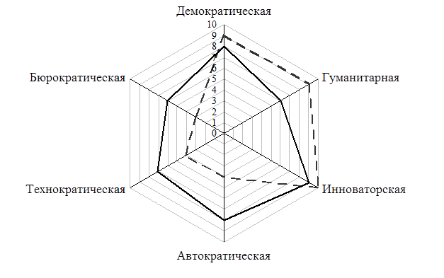 Сочетание структур управления на предприятии можно изобразить графически, на основе «измерения» шести типов управленческих ориентаций руководителя, в том числе формализованных (автократических или авторитарных, технократических и бюрократических) и трёх персонализированных (демократических, гуманитарных и инноваторских).