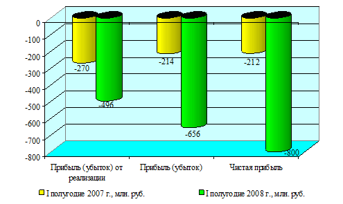 Прибыль от операционных доходов и расходов снизилась по сравнению с 6 мес. 2007 г. на 382 млн. руб., убыток от внереализационных доходов и расходов сократился на 156 млн. руб.