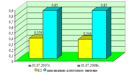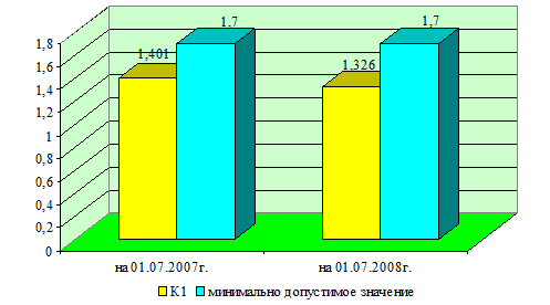 Значение данного коэффициента на 01.07.2007 г. и на 01.07.2008 г. соответствует нормативу, то есть ЧУП "Пищевой комбинат Белкоопсоюза" способно рассчитаться по своим финансовым обязательствам после реализации активов.