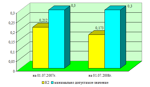 Коэффициент обеспеченности собственными оборотными средствами на 01.07.2007 г. и на 01.07.2008 г. не соответствует нормативу, это свидетельствует о том, что у ЧУП "Пищевой комбинат Белкоопсоюза" не достаточно собственных оборотных средств для ведения хозяйственной деятельности и обеспечения финансовой устойчивости.
