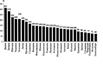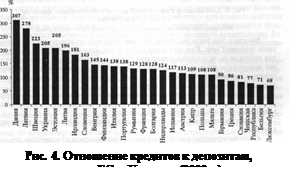 Масштабы валютного кредитования, которое значительно обострило экономические и социальные последствия глобального социально-экономического кризиса в странах Центральной и Восточной Европы (ЦВЕ), также радикально различались по странам данной группы, хотя в их банковских системах доминируют те же западноевропейские финансовые группы. Именно страны с наивысшей долей валютного кредитования (Латвия, Эстония, Венгрия, Украина) больше всех среди стран с формирующимися рынками страдают от глобального финансово-экономического кризиса (рис. 5).