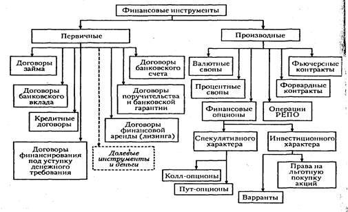 Заметим, что приведенные аргументы не являются абсолютно бесспорными. Тем не менее в приводимой ниже классификации акцент сделан на операции именно с финансовыми активами. При этом, имея и виду, что финансовые инструменты по определению суть договоры, можно сделать следующую их классификацию (рис. 1).