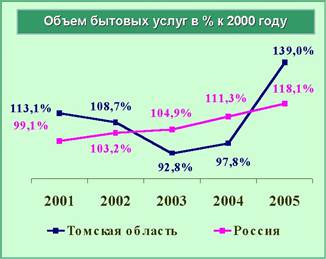 В 2005 году на рынке бытовых услуг Томской области была преодолена тенденция спада объема бытовых услуг. По данным статистики в 2005 году через все каналы реализации населению области оказано бытовых услуг на сумму 2 234,8 млн. рублей, что к 2004 году в сопоставимых ценах составляет 142,1%.