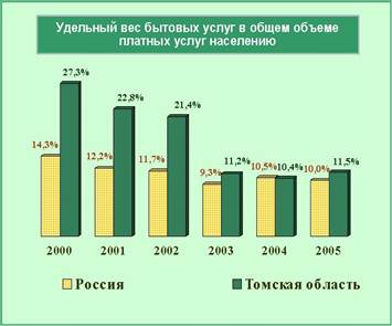 Удельный вес бытовых услуг в общем объеме платных услуг на территории Томской области в 2005 году составил 11,5 % (2004 год - 10,4%). По данному критерию Томская область опережает средние показатели по Российской Федерации (10,0 %).