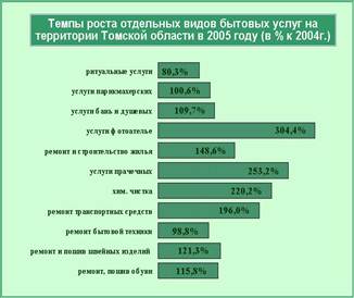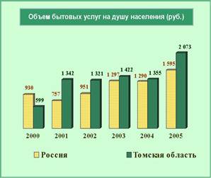 В 2005 году в Томской области было оказано бытовых услуг в расчете на одного человека на сумму 2 073 руб., в то же время в целом по Российской Федерации данный показатель составил 1 595 руб. Таким образом, областной показатель превысил среднероссийский на 30%.
