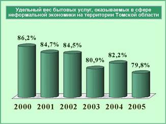 По данным Томскстата доля бытовых услуг, оказываемых в сфере неформальной экономики, составляет 79,8 % от общего объема бытовых услуг. Вместе с тем, в последние годы прослеживается последовательное снижение данного показателя.