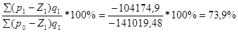 ∆прибыли = ∑(p1 – Z1)q1 – ∑(p0 – Z0)q0 = –104174,9 + 32509,82 = –71665,08 тыс.руб.