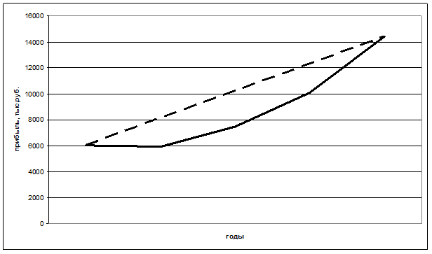 Рисунок 1 – Динамика прибыли от реализации продукции в ООО «Путь» ────── – фактическое значение прибыли ---------- – выровненное значение прибыли по уравнению прямой