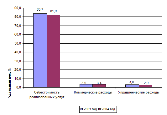 Анализируя структуру расходов от обычного вида деятельности ОАО «Хабаровский грузовой автокомбинат» можно отметить в 2004 году снижение удельного веса себестоимости реализованных услуг (81,9%), коммерческих расходов (3,4%) и управленческих расходов (2,9%) по отношению к полученной выручке за реализованные услуги по грузоперевозкам (рис. 2)