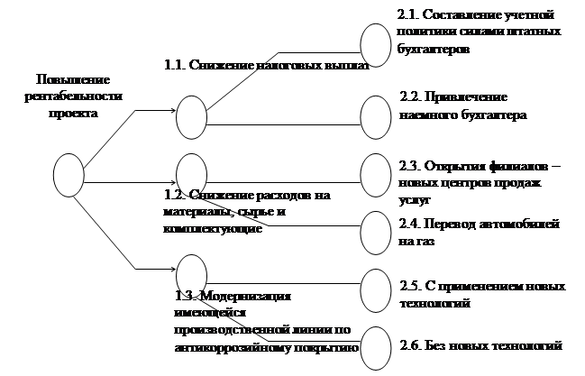 Тогда, в терминах системного анализа, можно главную цель обозначить как повышение рентабельности проекта, а в качестве подцелей принять перечисленные способы достижения главной цели. Так, главная цель – повышение рентабельности проекта – может быть достигнута путем: снижения налоговых выплат, снижения расходов на материалы, сырье и комплектующие, а также путем снижения внутрипроизводственных издержек; В свою очередь, эти подцели могут быть достигнуты следующими путями: снижение налоговых выплат можно осуществить за счет составления новой учетной политики силами штатных бухгалтеров или силами привлеченных специалистов; снижение расходов на сырье, материалы и комплектующие можно осуществить путем открытия филиалов (для уменьшения расстояний при выезде к заказчику для оказания услуг по грузоперевозкам) или путем перевода автомобилей на газ (что снизит расходы на горюче-смазочные материалы); снижение внутрипроизводственных расходов на участке антикоррозийного покрытия автомобилей можно осуществить путем внедрения новых технологий или без них.