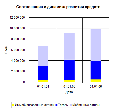 Из диаграммы 2 мы видим ,что статья товары в суммовом выражении растет, однако удельный вес товаров во всем имуществе снижается с 64,9% на 01.01.04 до 52,9% на 01.01.06.