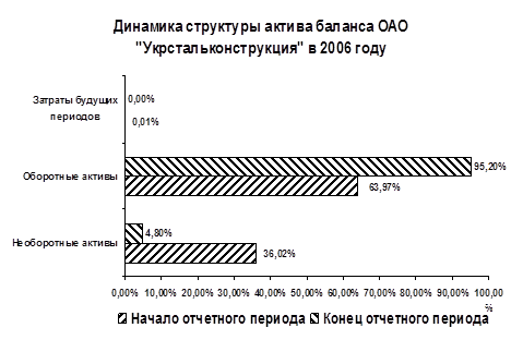 Как мы можем судить из таблицы в приложении К, имущество предприятия за 2006 год возросло на 14938 тысячи гривен, что является положительным фактором. Наибольший удельный вес в структуре баланса имеют оборотные активы (95,20% к концу года), наглядно это показано на Диаграмме 3, это говорит о достаточно мобильной структуре активов, «легкой» их структуре, и является положительным фактором. Опережение темпов роста оборотных активов над внеоборотными свидетельствует о расширении производственной деятельности предприятия. Внеоборотные активы предприятия уменьшились за отчетный период на 32229 тыс. грн, а их доля в активах баланса уменьшилась на 31,22% (с 36,02% в начале до 4,80% в конце года), что так же является положительным фактором.