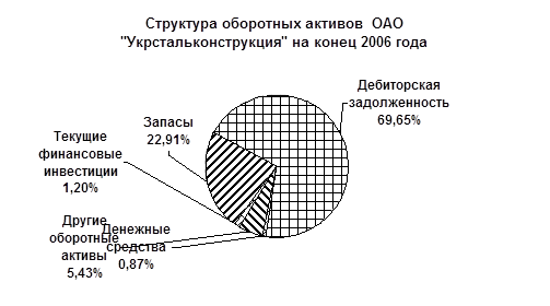Оборотные активы предприятия в 2006 году увеличились на 47068 тыс. грн. При этом следует отметить, что как видно по Диаграмме 4 доля дебиторской задолженности (69,65%) превышает аналогичный показатель денежных средств (0,87%), что свидетельствует о проблемах в оплате продукции предприятия потребителями и преимущественно безналичном характере расчетов предприятия. Кроме того увеличилась стоимость запасов на 7484 тыс. грн, и дебиторской задолженности на 36372 тыс. грн. что являются отрицательными факторами. Сопоставив суммы дебиторской (79635 тыс. грн.) и кредиторской задолженности (101081 тыс. грн.) можем сказать, что сальдо задолженности предприятия было пассивным, то есть предприятие формировало свои запасы и отсрочки платежей должников за счет невыполнения обязательств перед кредиторами. При этом доля денежных средств в оборотных активах уменьшилась на 1,22%, что так же является отрицательной тенденцией.