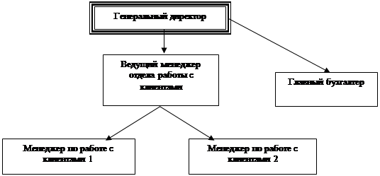 Общая организационная структура, как и множества малых фирм, предельно проста (рис. 1). Организацию возглавляет директор. Директор организует и координирует работу по всем направлениям туристической деятельности.